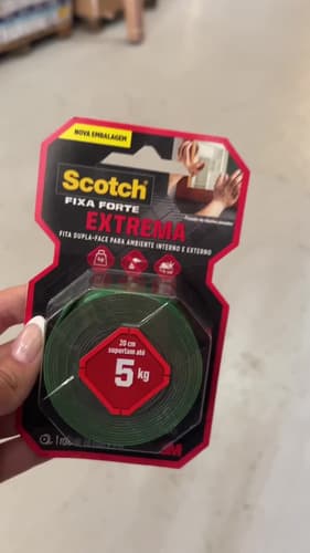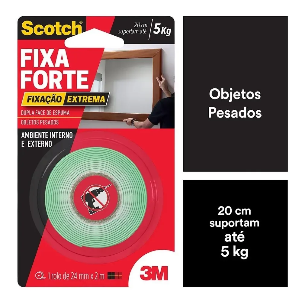 Fita dupla face 3M Scotch Fixa Forte com fixação extrema — suporta até 5kg por 20cm de fita. Dimensões: 24mm x 2m. Substitui pregos e parafusos com aplicação rápida, limpa e sem furos. Ideal para quadros, espelhos, painéis e decorações. Funciona em superfícies internas. Transparente. Marca 3M com alta qualidade e confiabilidade comprovada. Clientes avaliaram com 5 estrelas.