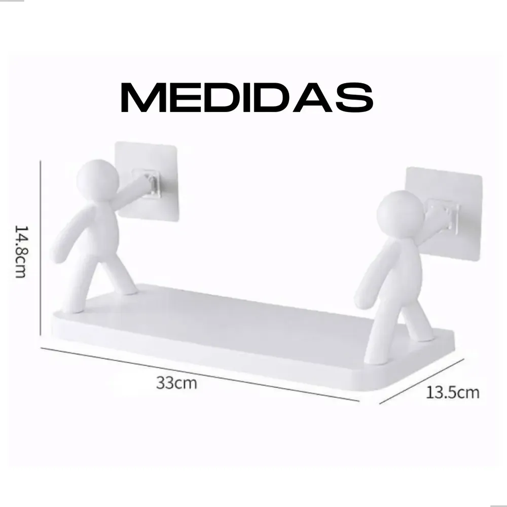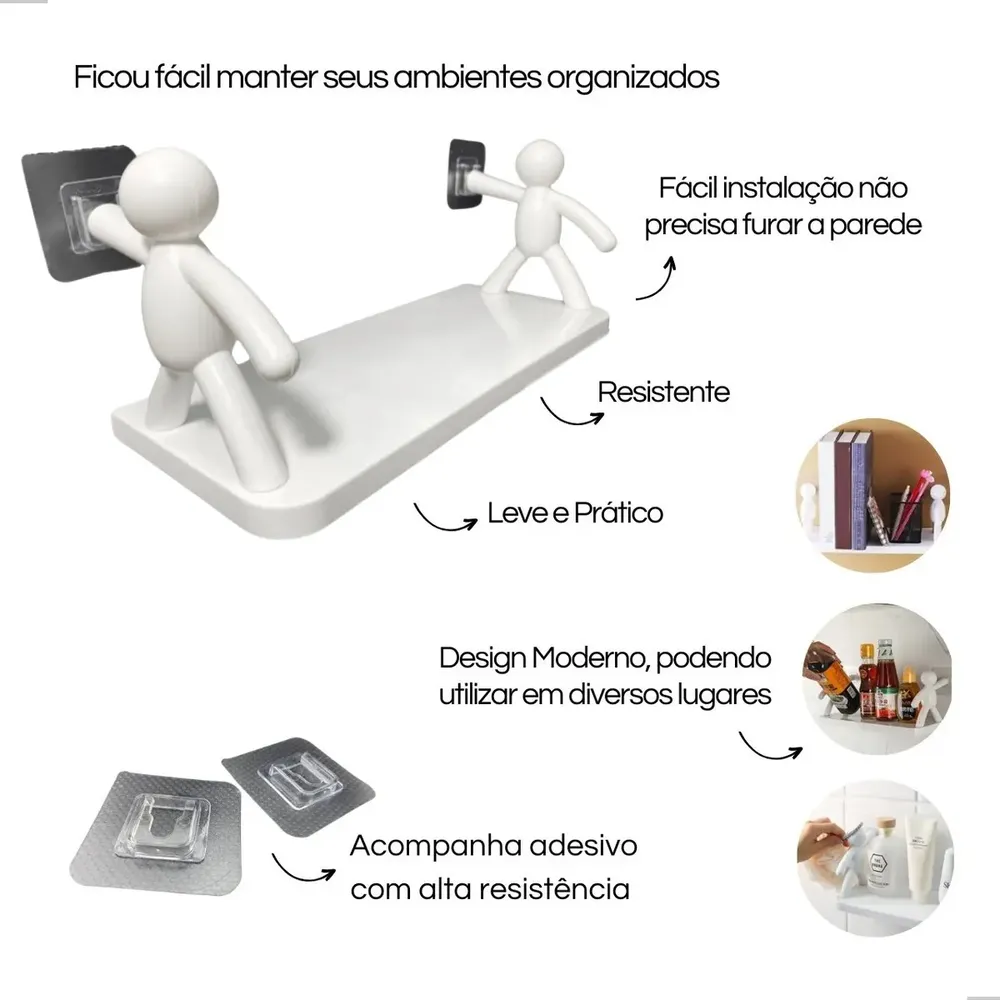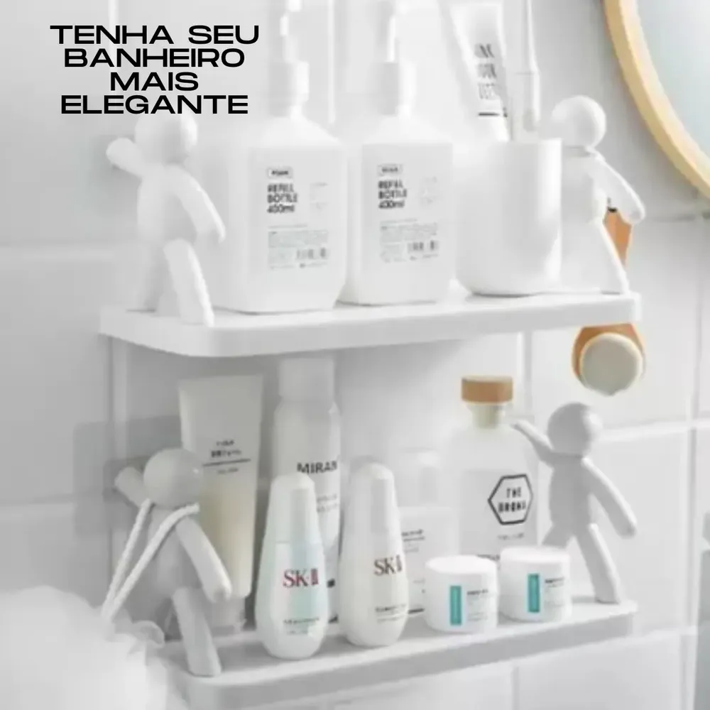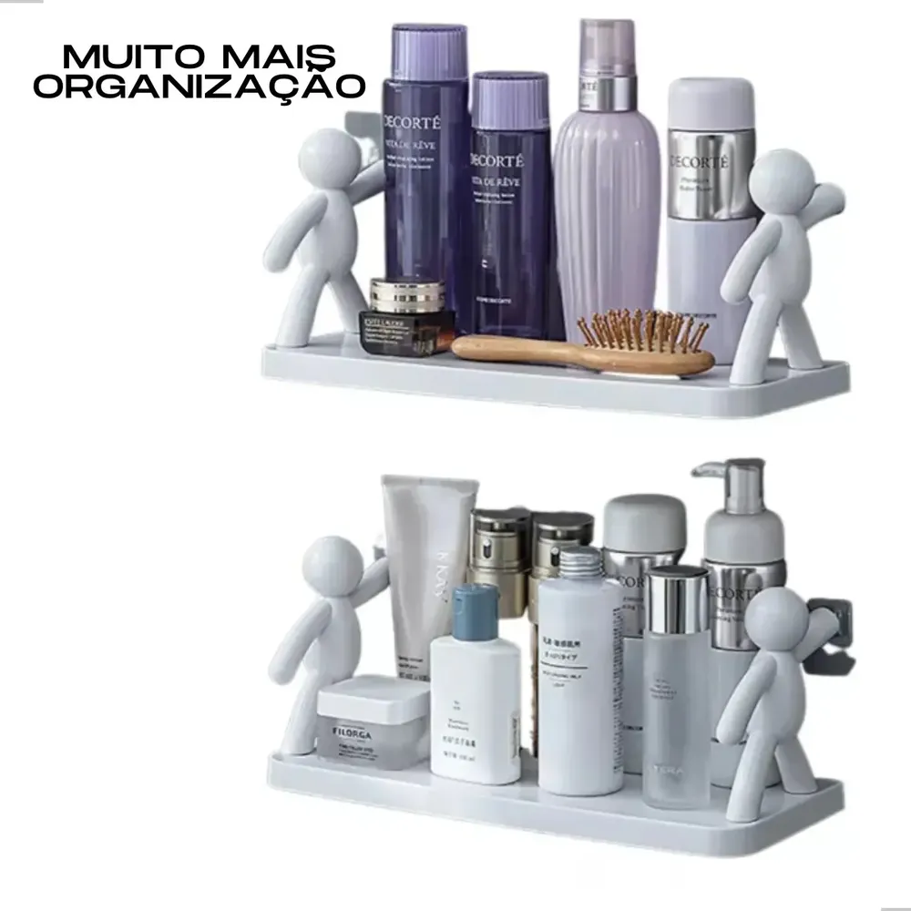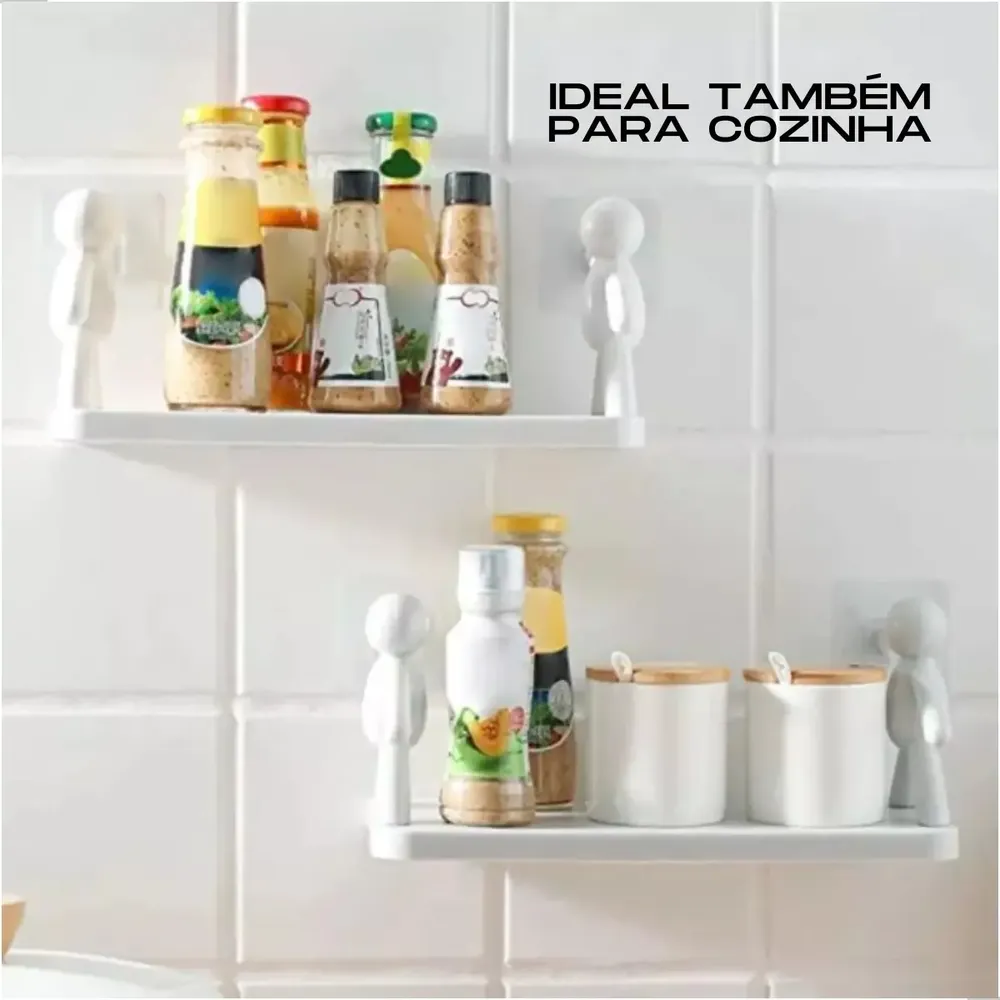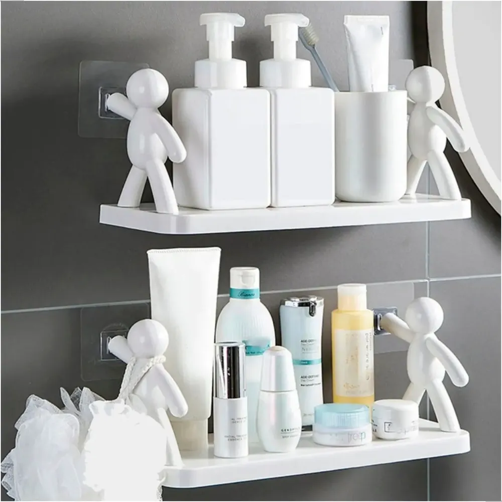 Prateleira organizadora sem furo para banheiro e cozinha. Design divertido com bonequinhos simulando segurar a prateleira. Fixação autoadesiva, sem necessidade de furar paredes. Material plástico resistente. Ideal para organizar produtos de beleza, shampoos e itens no box do banheiro. Inclui 2 prateleiras. Fácil instalação: limpe a superfície, remova o adesivo e pressione. Aguarde 24h para total fixação. Medidas: 33x14,5x13,8cm.